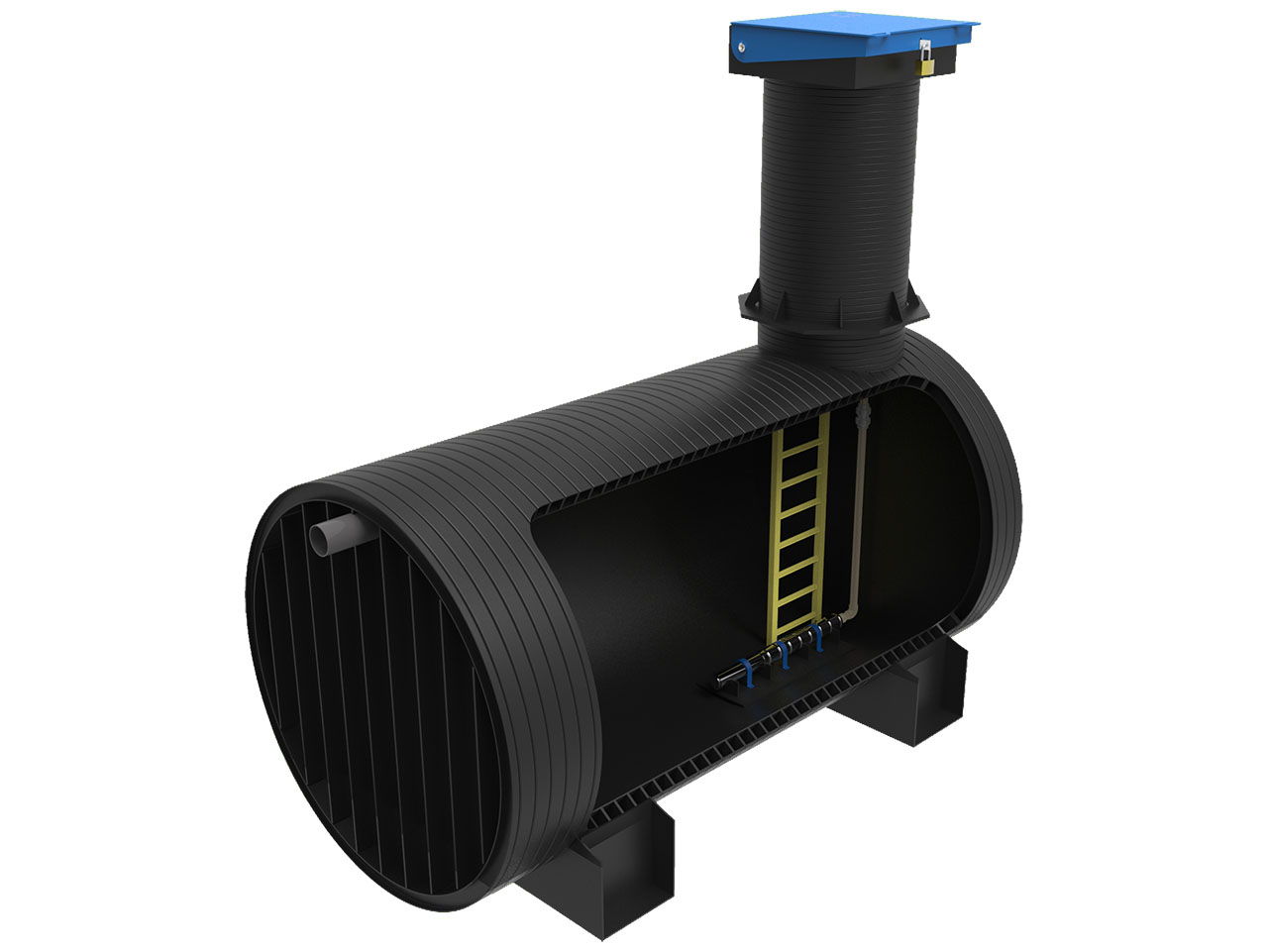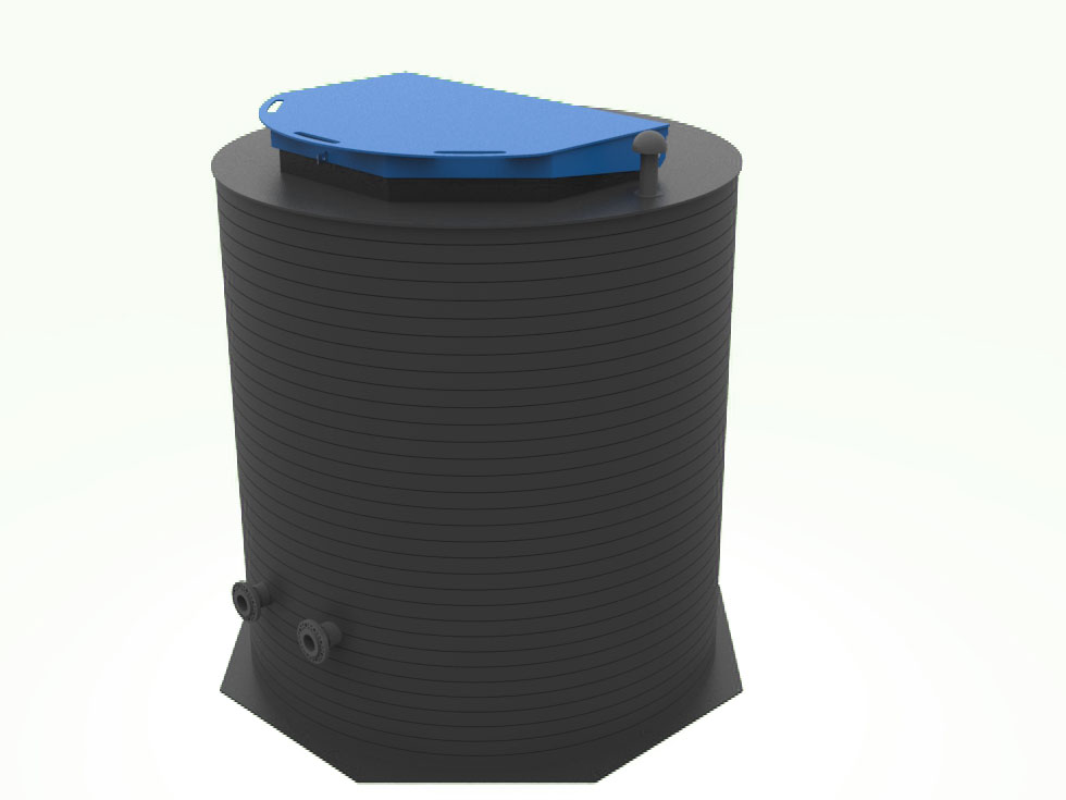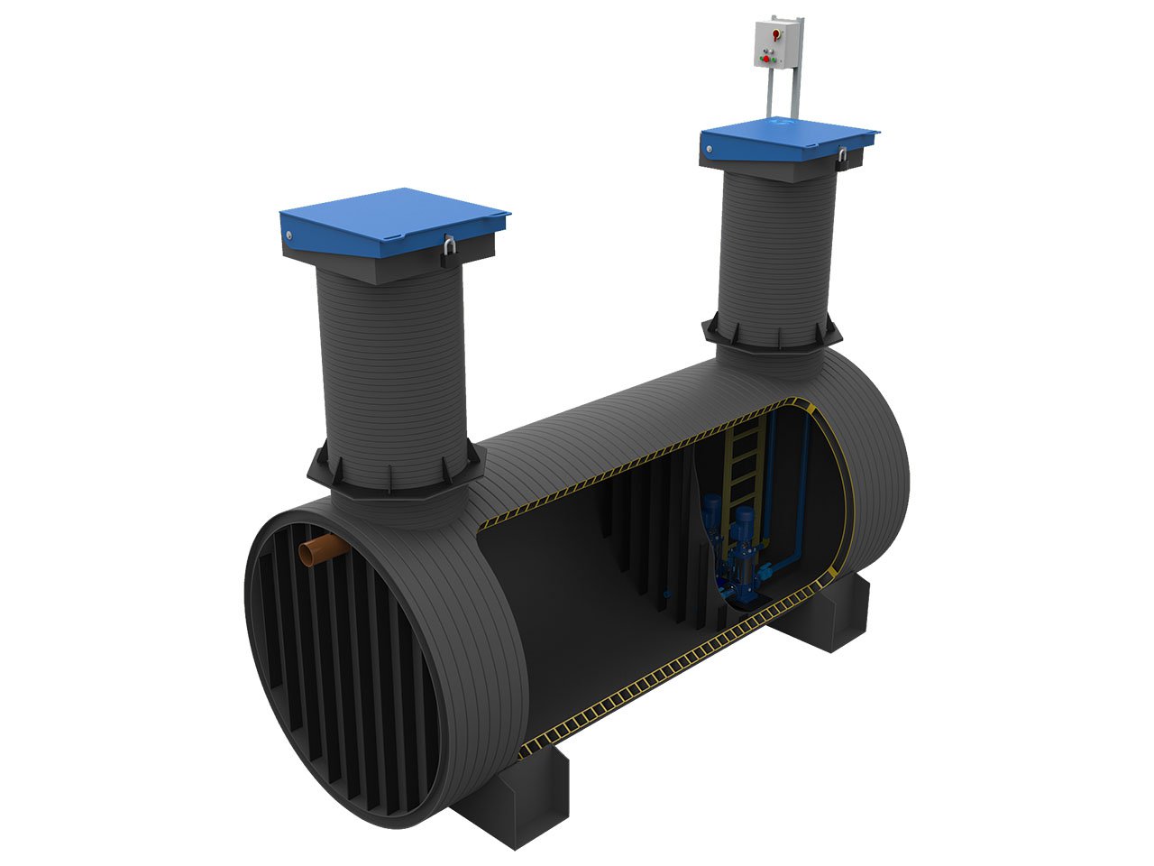 Подземная модульная станция представляет собой цилиндрический корпус с насосным оборудованием, установленным внутри конструкции.