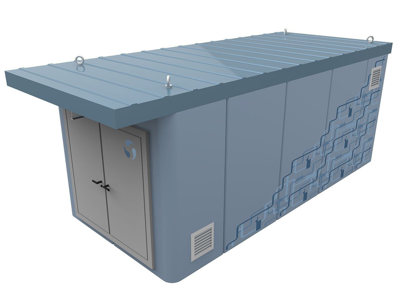 Модуль водопроводной станции выполнен из стального каркаса, обшитого сэндвич-панелями с утеплителем из минеральной ваты и металлической дверью.